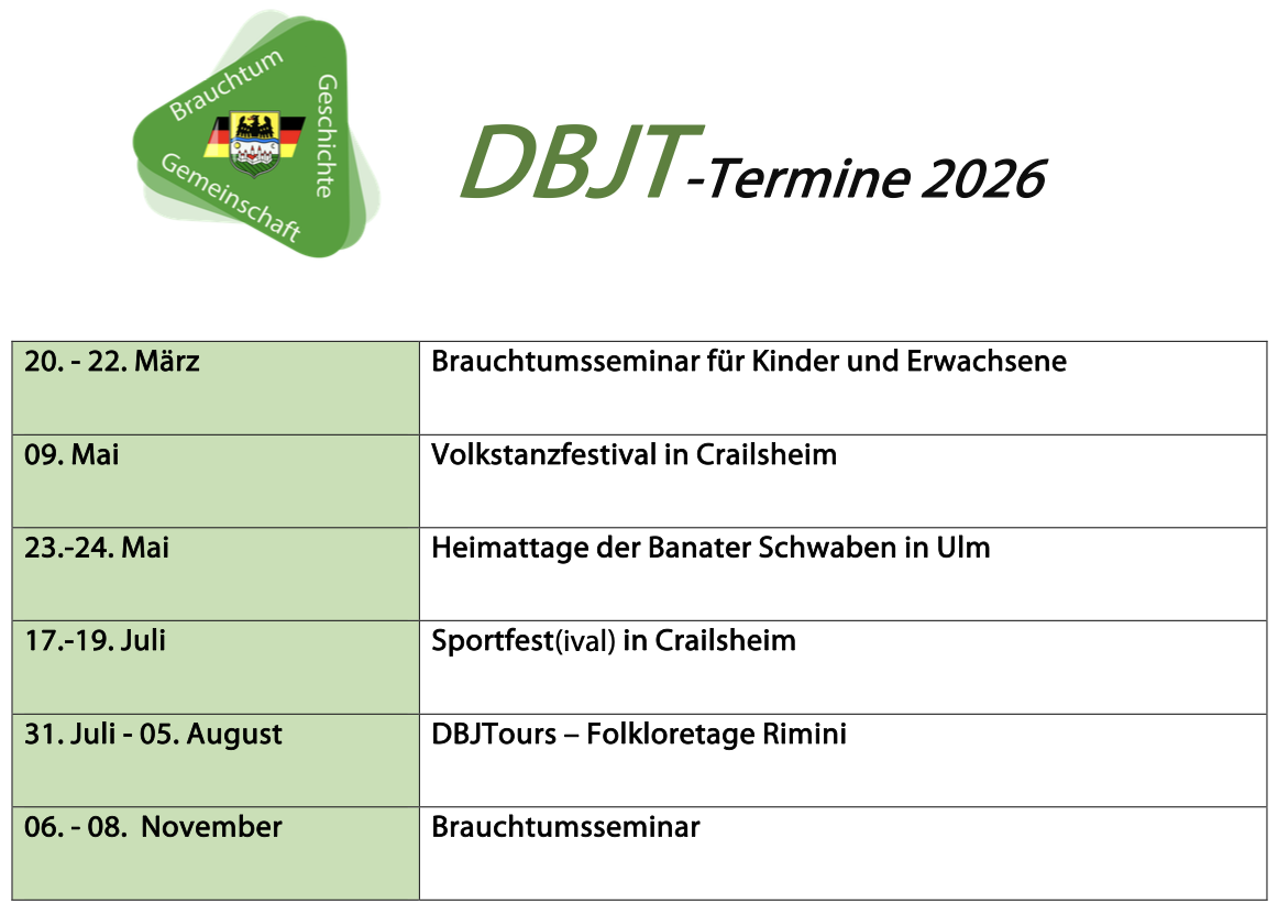 Herzlich Willkommen auf der Website der Deutschen Banater Jugend- und Trachtengruppen. Hier findest du alle Infos von wie du mit uns in Kontakt trittst bis wo und wann unsere nächsten Veranstaltungen stattfinden. Klick dich einfach durch. Hab keine Scheu dich bei uns unter info@dbjt.de zu melden, falls du Fragen hast.